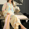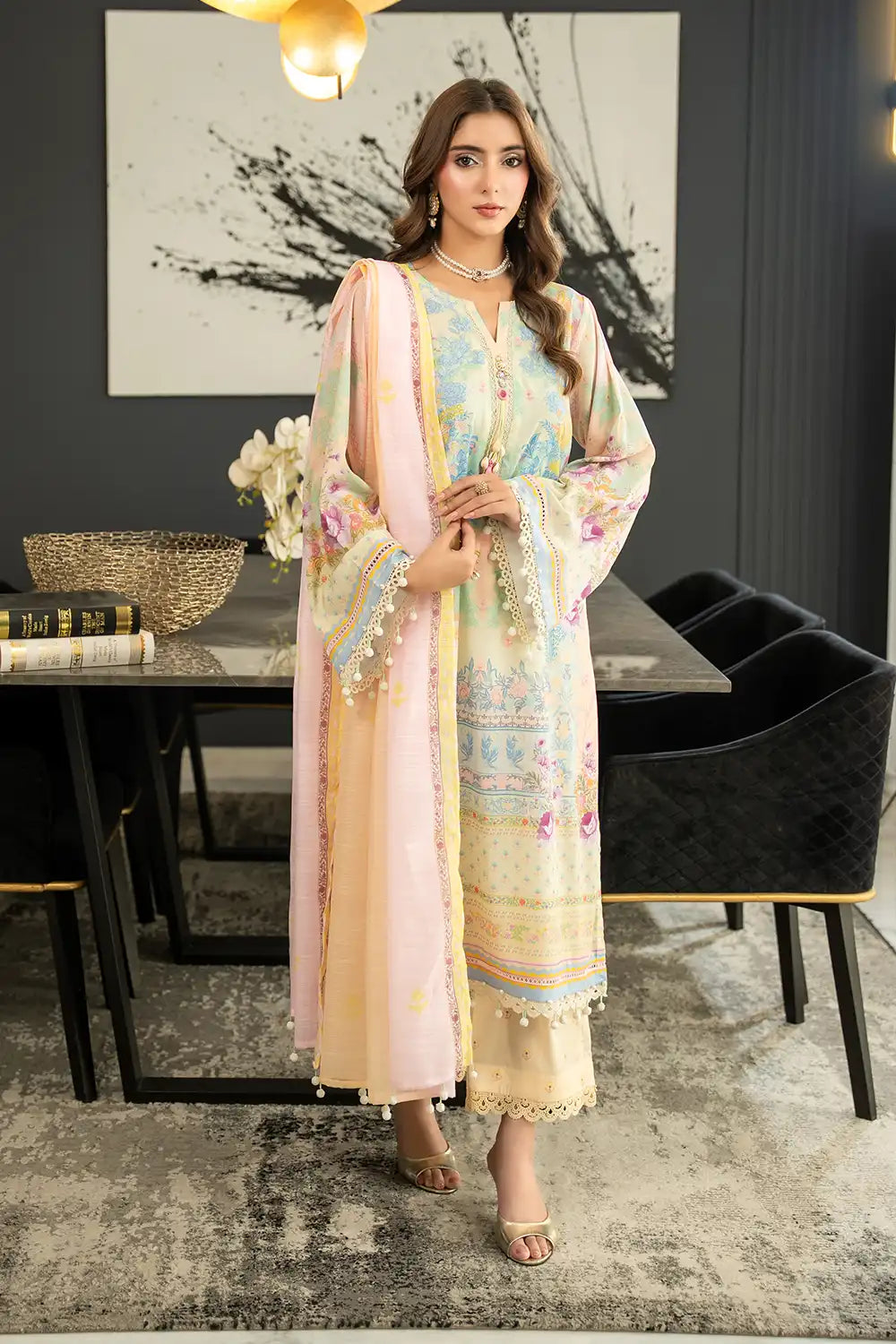 A graceful pastel silk kurta featuring soft floral prints in shades of pink, yellow, and blue. The neckline is embellished with charming tassels, while lace and BALL HANGINGS edging add a refined, feminine touch. Ideal for daytime festivities or elegant casual wear.
