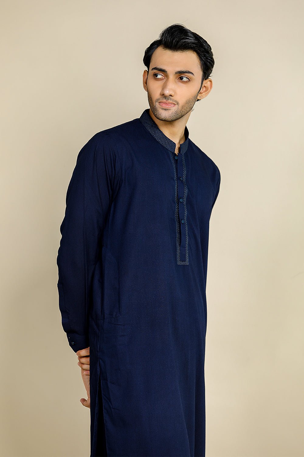 Navy Blue Cotton Embroidered Kameez Shalwar For Men
