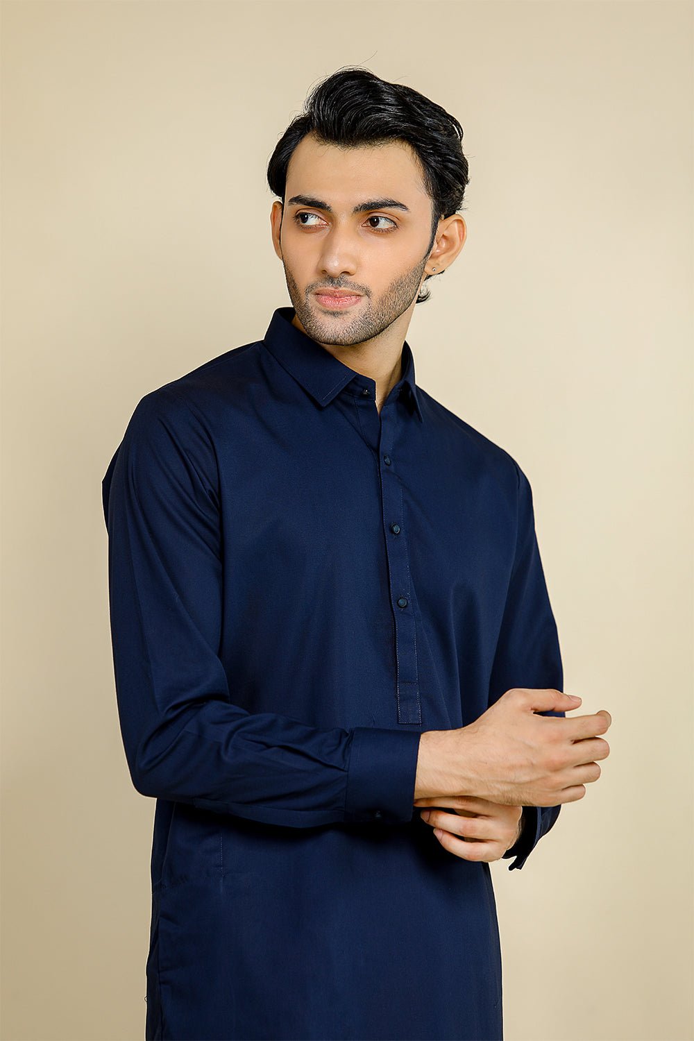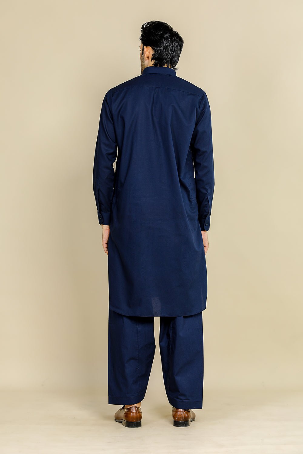 Navy Blue Cotton Satin Kameez Shalwar For Men