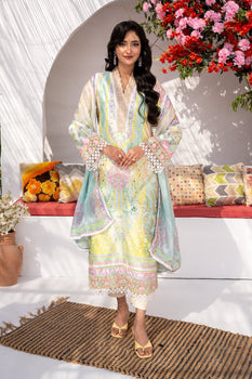 3 Pc Printed Embroidered Charmeuse Silk Unstitched Suit