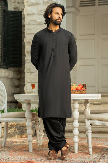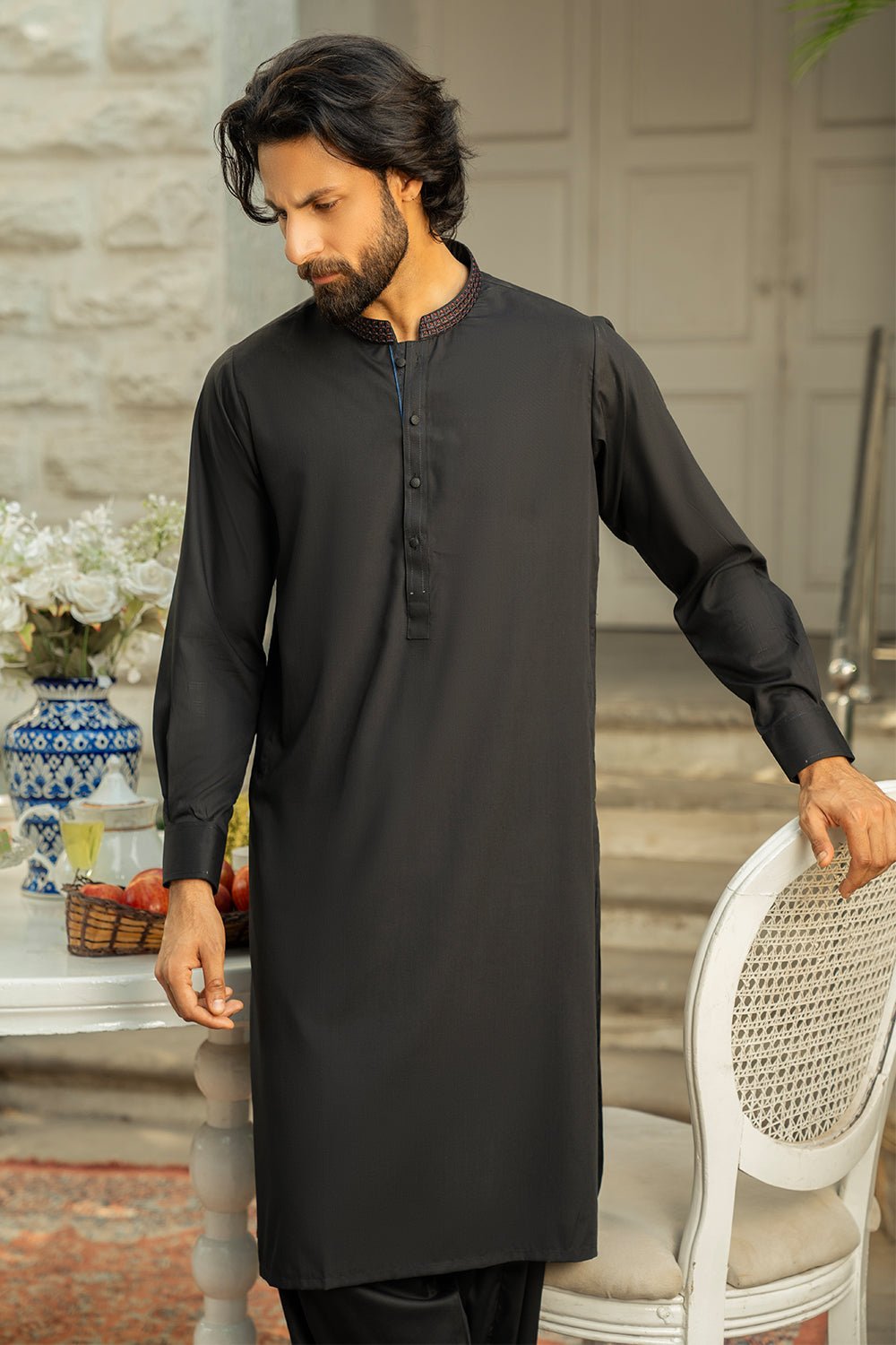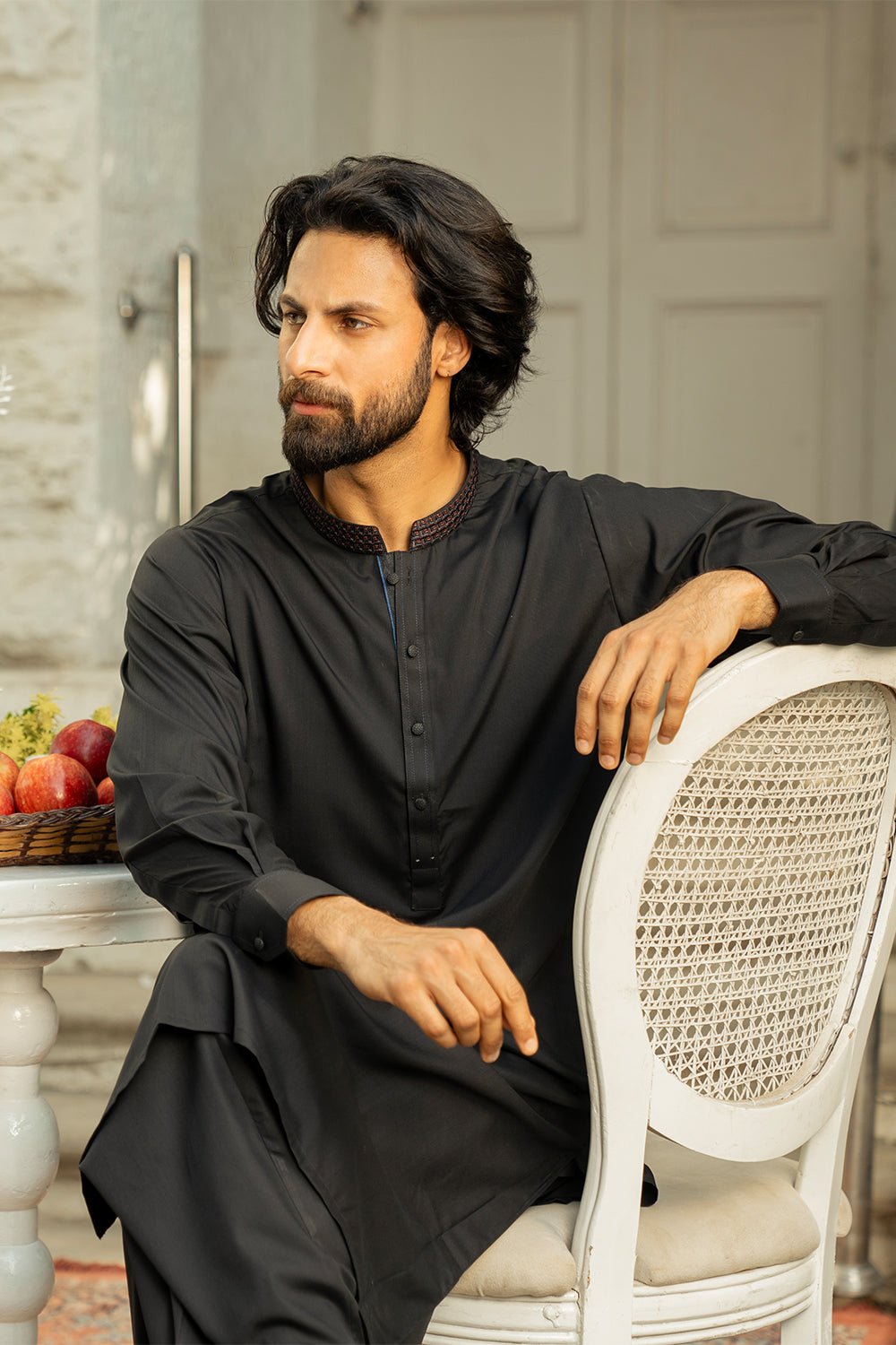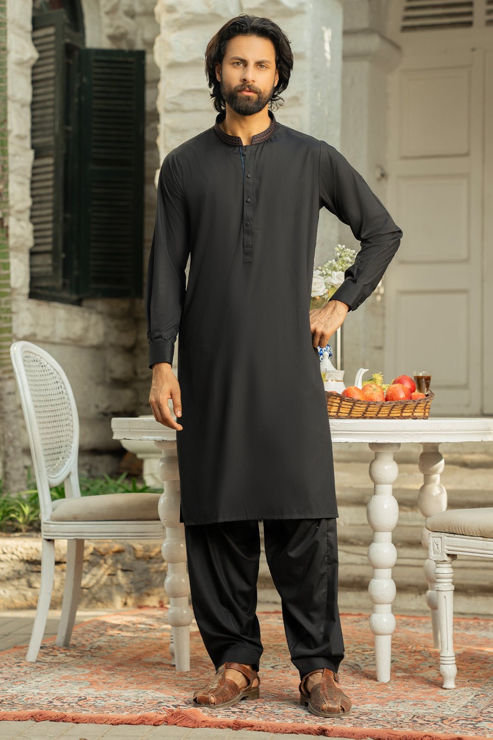Black Embroidered Wash & Wear Shalwar Kameez For Men